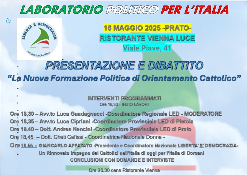 EVENTI – A PRATO PRESENTAZIONE E DIBATTITO “LA NUOVA FORMAZIONE POLITICA DI ORIENTAMENTO CATTOLICO”